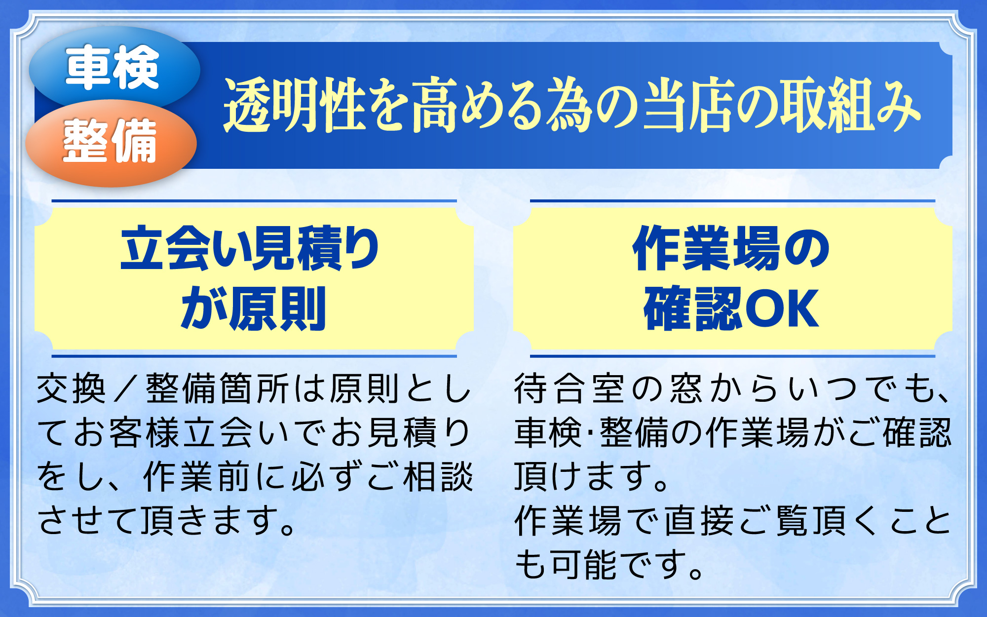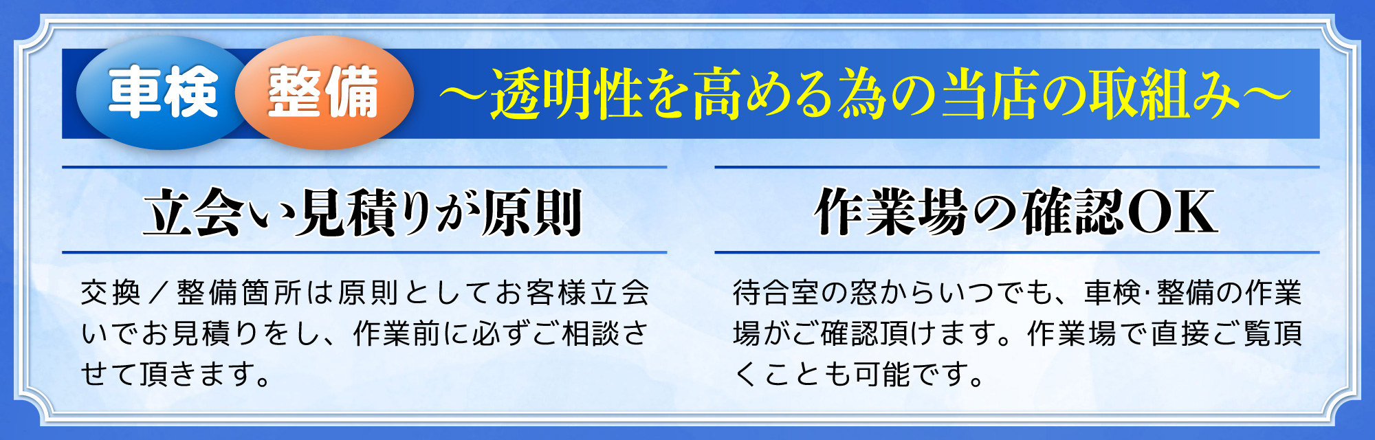 後日書面と口頭だけで整備項目や請求金額が伝えられるディーラー整備等と異なり、整備が必要な箇所をその場で実際にご確認頂けるため、「整備が必要な項目の納得がしやすい」・「金額の透明性が高い」と多くのお客様にご支持頂いております。