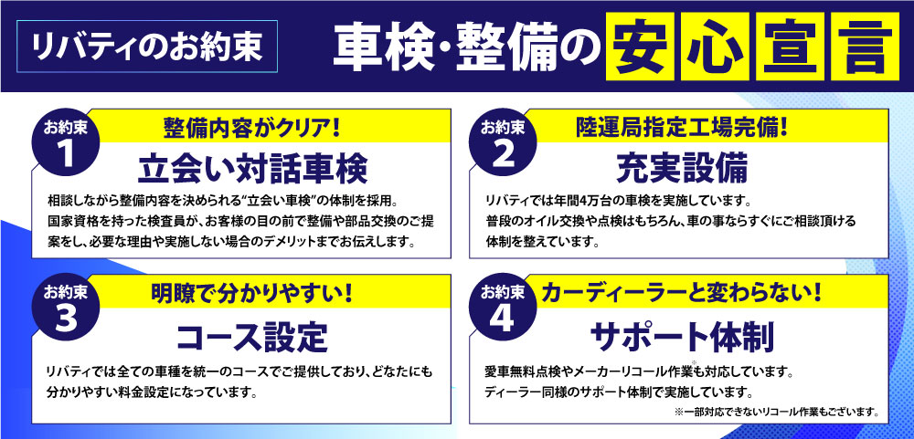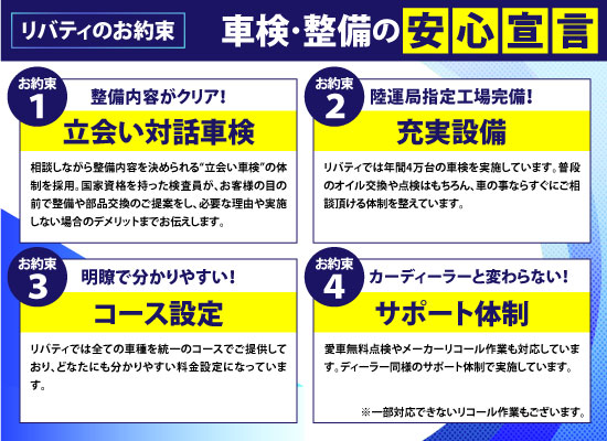 八尾市・柏原市・松原市・東住吉区・阿倍野区・生野区・西成区・藤井寺・平野区・羽曳野エリアのお客様が安心してご利用いただけるように、【車検後2年間の保証】もお付けしております。